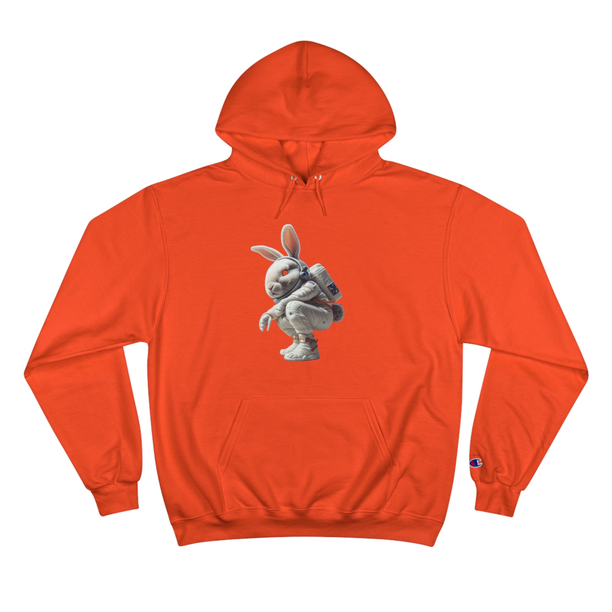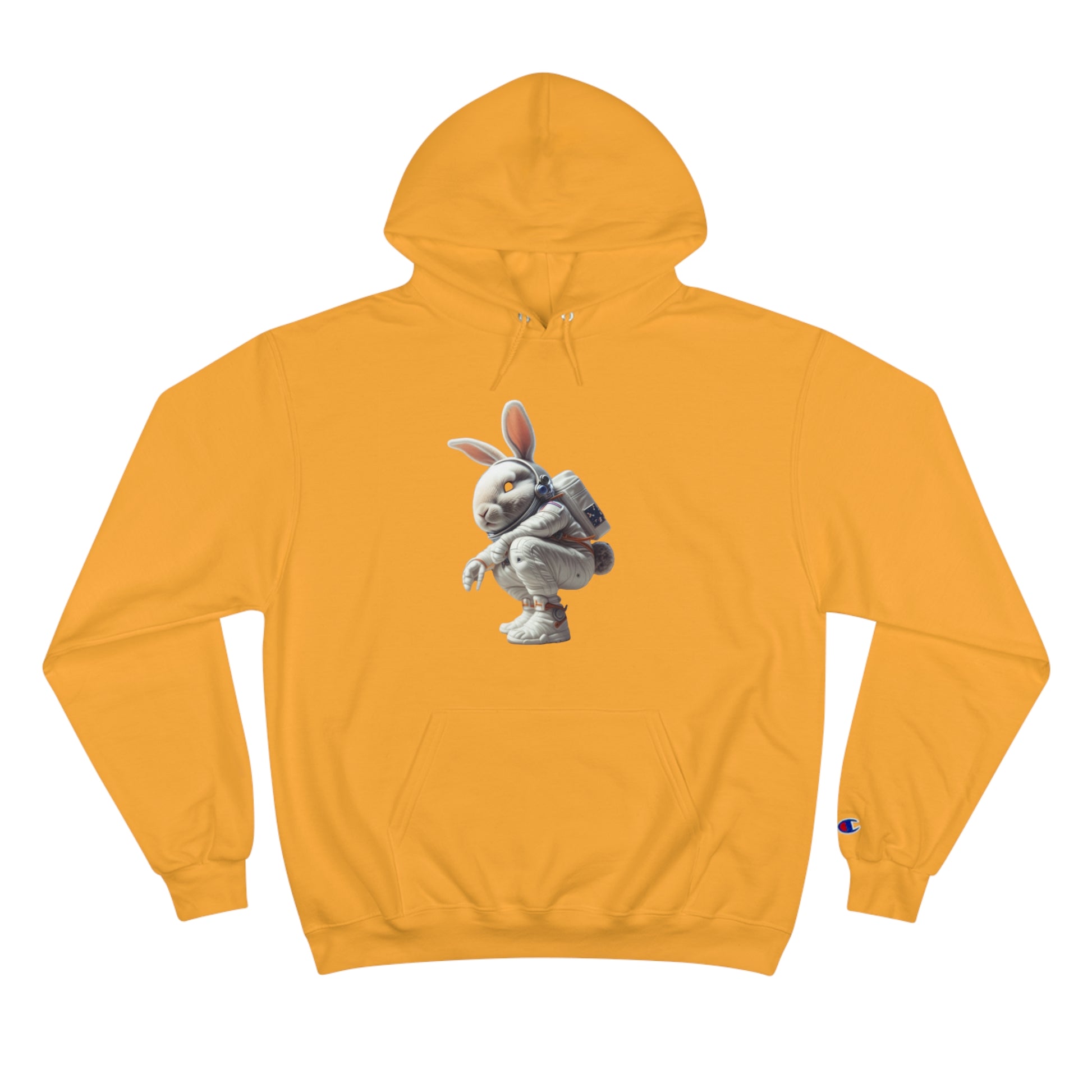 This custom Champion Hoodie features a whimsical design of a white rabbit traveling to outer space, giving off a quirky and fun vibe. Perfect for those who love unique and eye-catching clothing pieces, this hoodie is ideal for casual wear or lounging around. It is relevant to those looking for cozy and warm clothing options for everyday use or as a statement piece for special occasions like Halloween or Comic-Con.