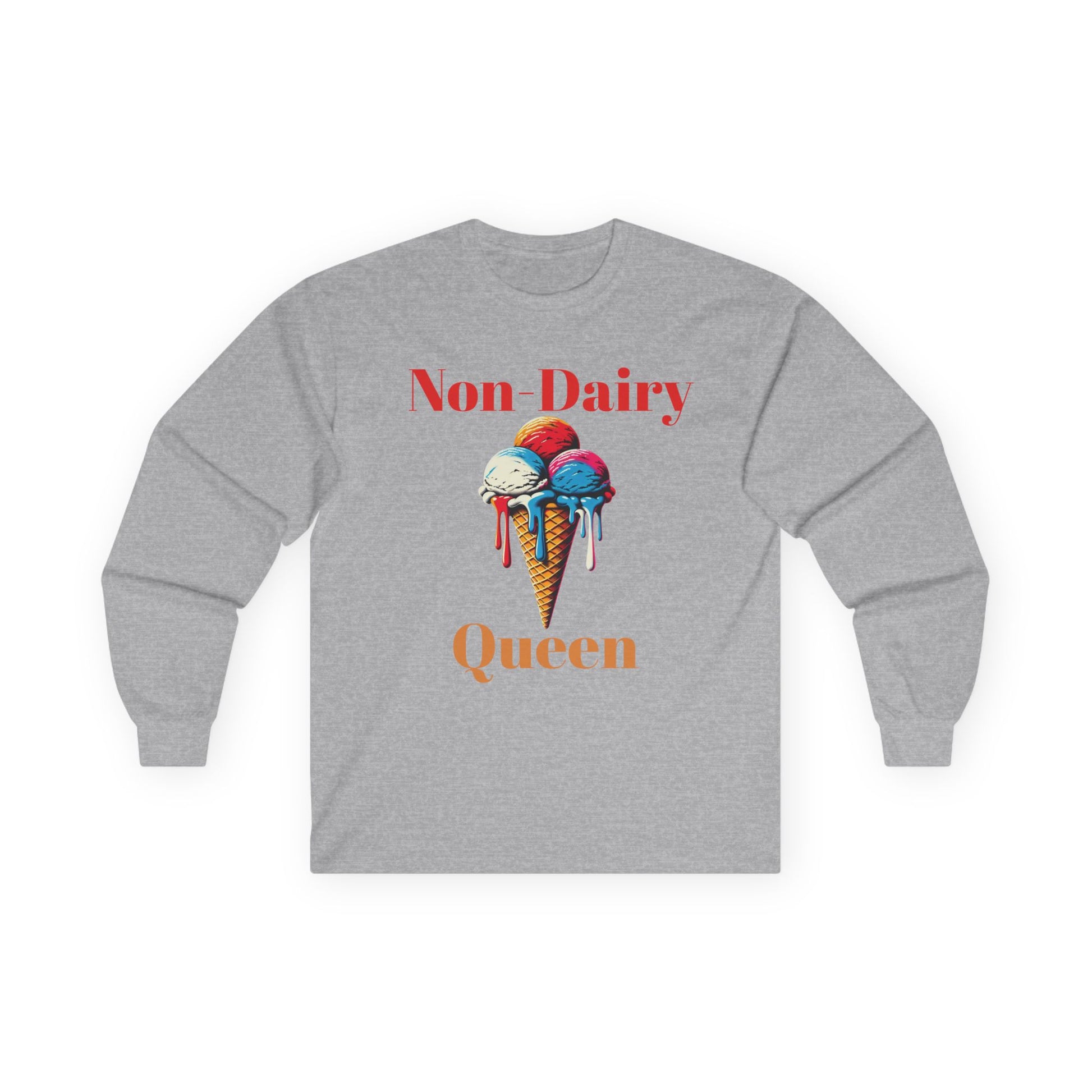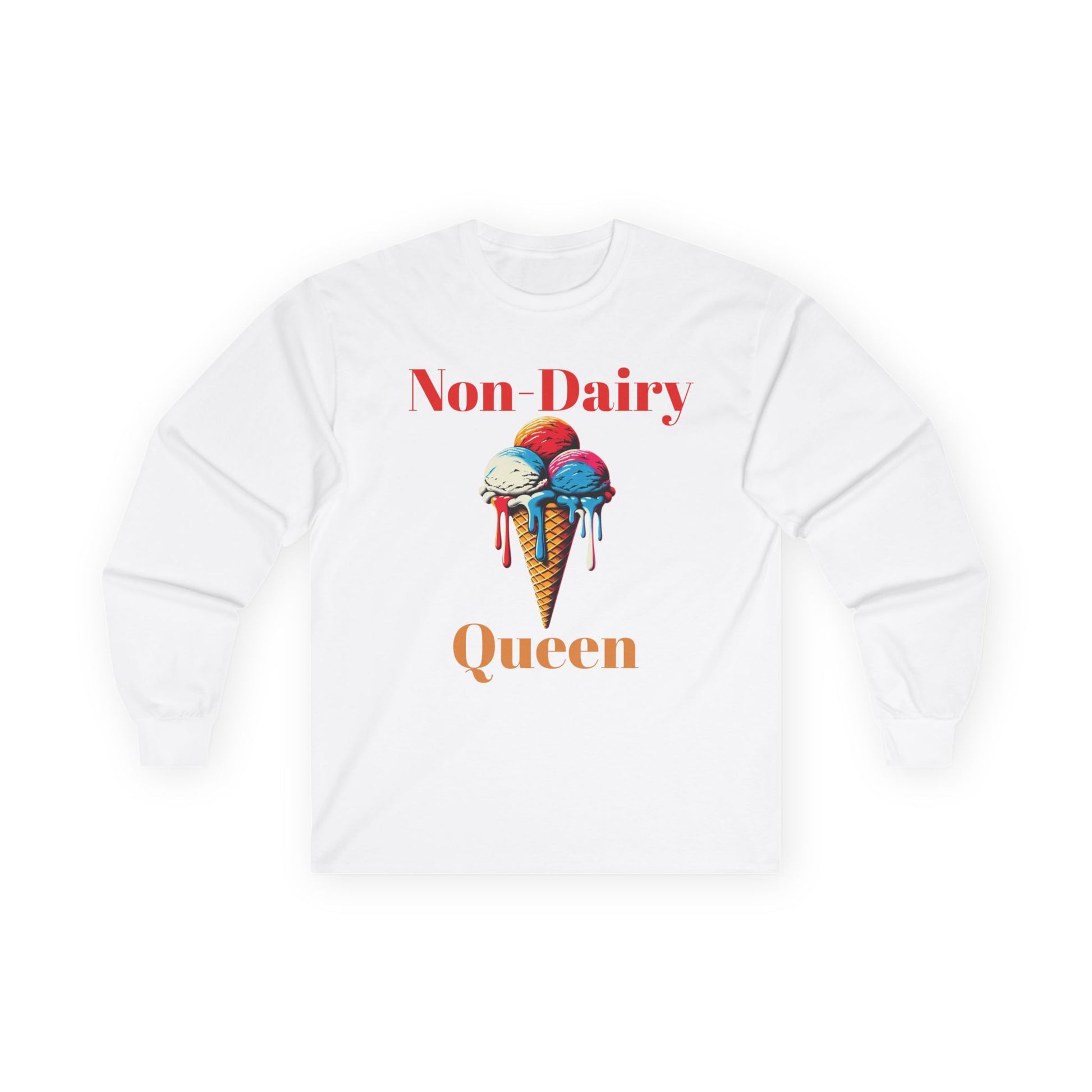 This Long Sleeve Tee is perfect for non dairy queens who love ice cream even when it's cold outside. It provides a cozy and comfortable vibe, making it great for casual wear during any season. Ideal for adults looking for a unique and fun top to add to their wardrobe. Suitable for everyday wear and also great for holidays and casual celebrations.