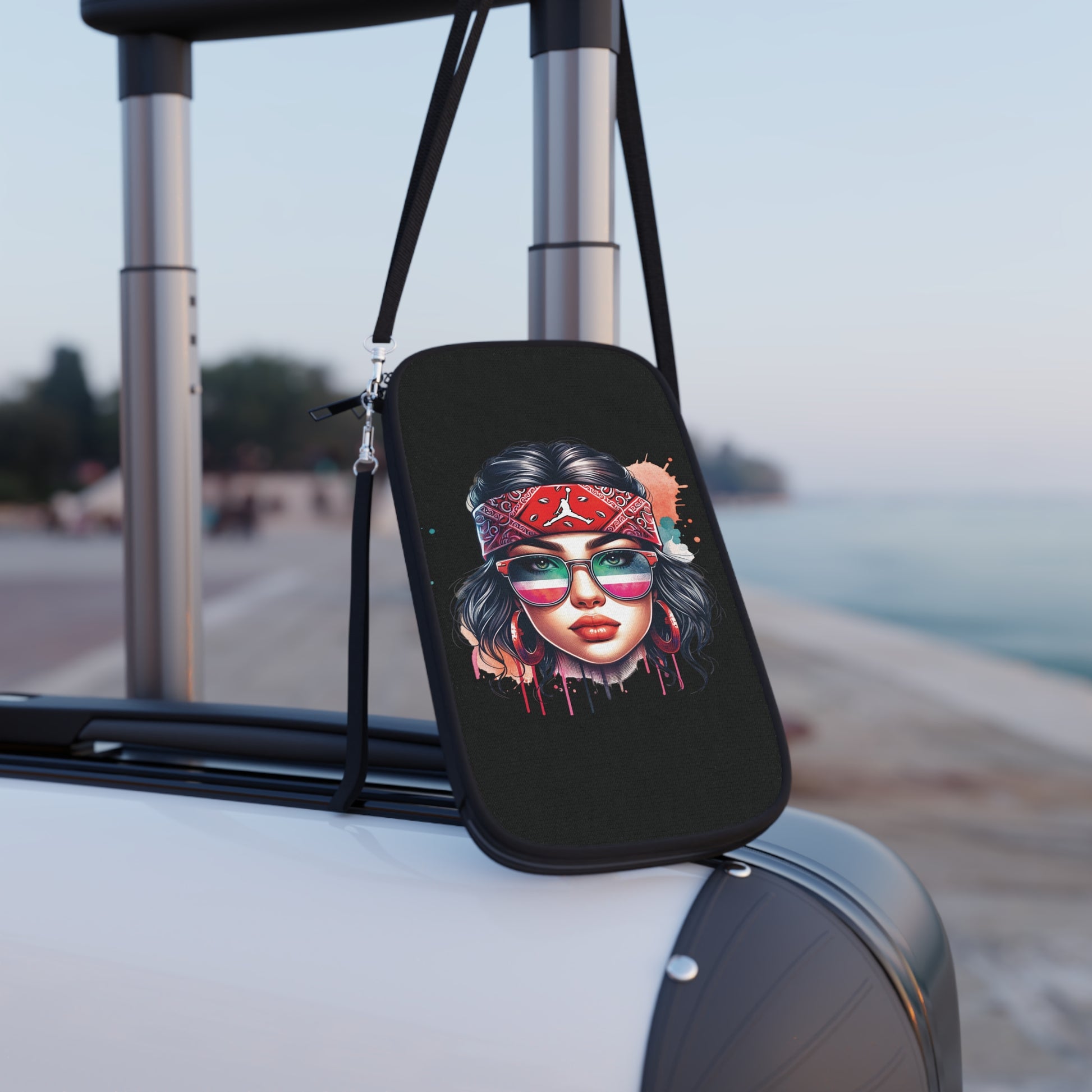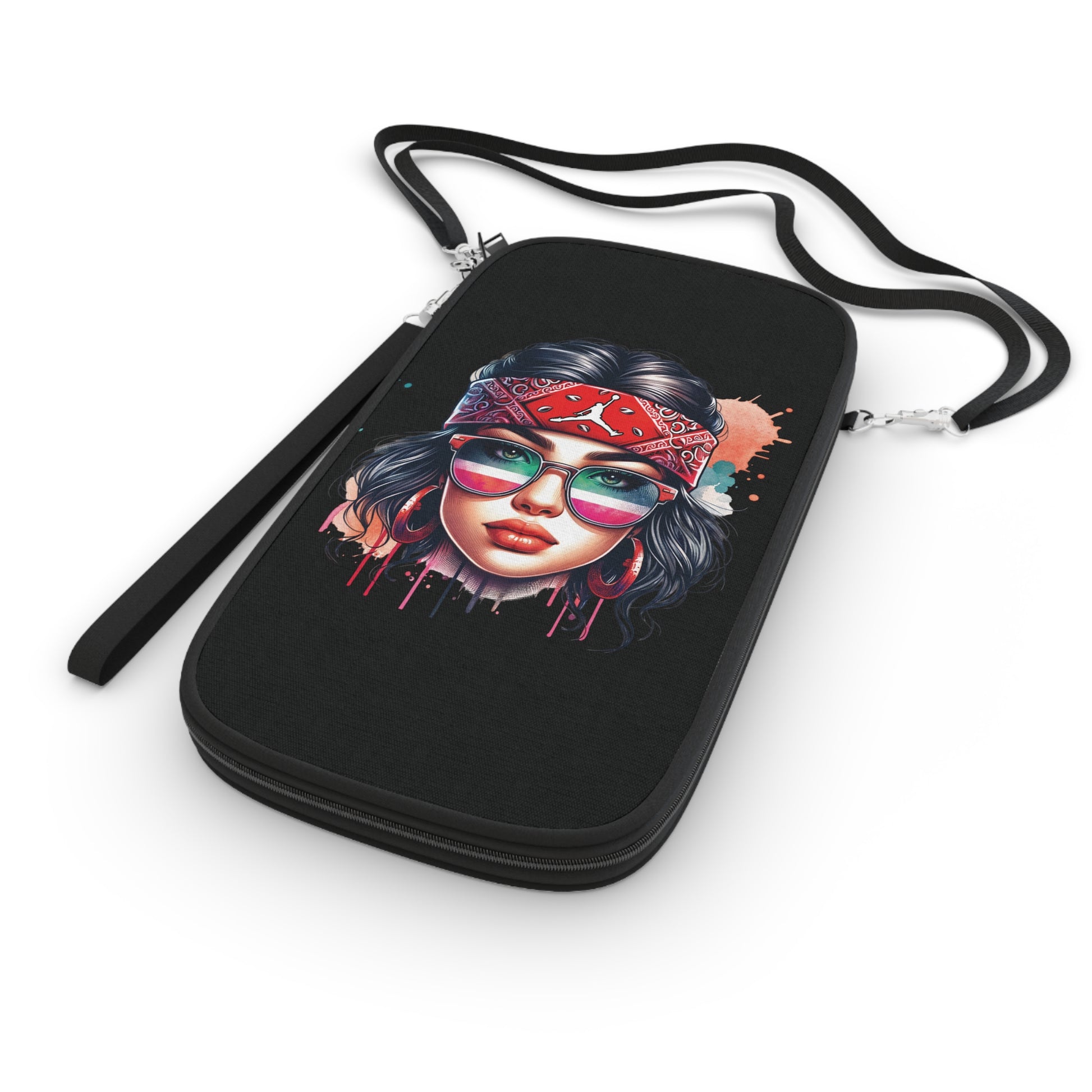.: Black detachable and adjustable shoulder strap and a black wrist strap